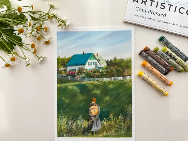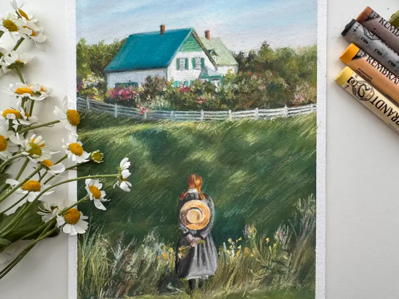 소프트파스텔로는 세밀한 표현이 어려워서 프리즈마색연필로 앤을 먼저 그려주고 배경은 소프트파스텔로 그려주었어요