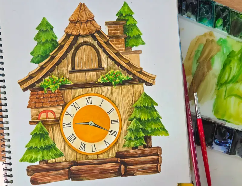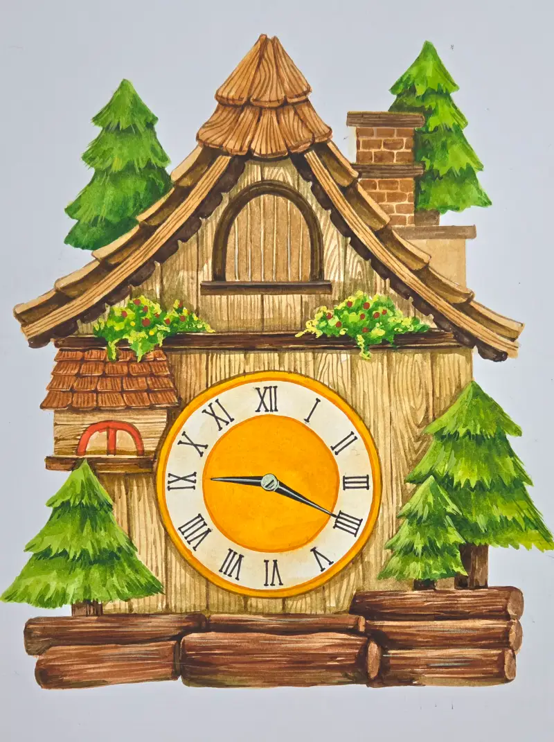 "뻐꾸기시계가 실제 집이면 어떨까?" 하는 상상을 해봤고 나무로 만들어진 집의 형태로 그려보았습니다ㅎ