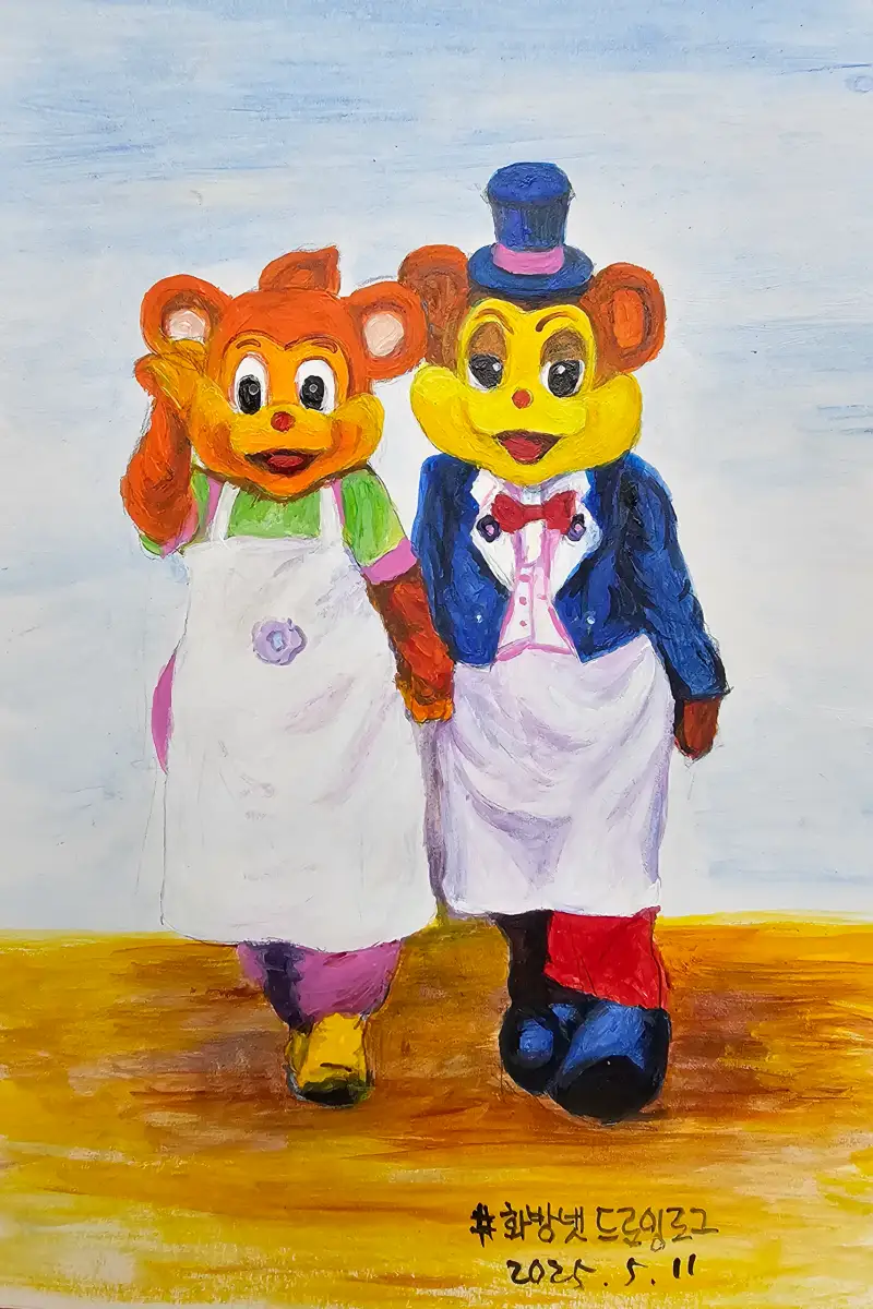 놀이공원에 가서 만나면 기분이 업되는 캐릭터를 그렸어요. 이 캐릭터는 시골쥐와 서울쥐인데요~ 원래는 레스토랑등 실내에서 자주 만나는데, 자유롭게 바깥을 활보하면 더좋겠다는 마음을 담아 그렸어요~