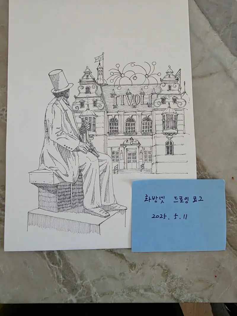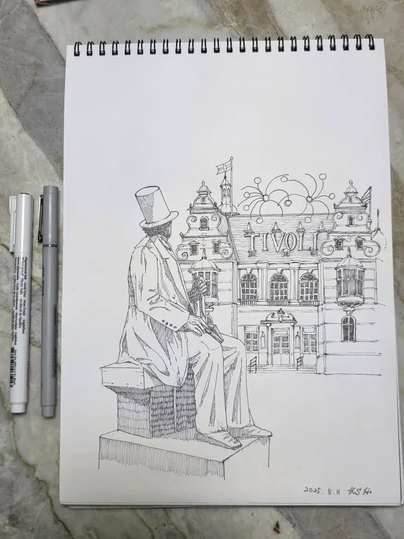 덴마크 코펜하겐에 위치한 티볼리 놀이공원이에요. 건너편에 안데르센 동상이 있는데 티볼리 놀이공원을 응시하며 앉아있는 모습이 인상적이었어요. 펜으로만 표현해 봤어요.