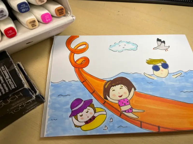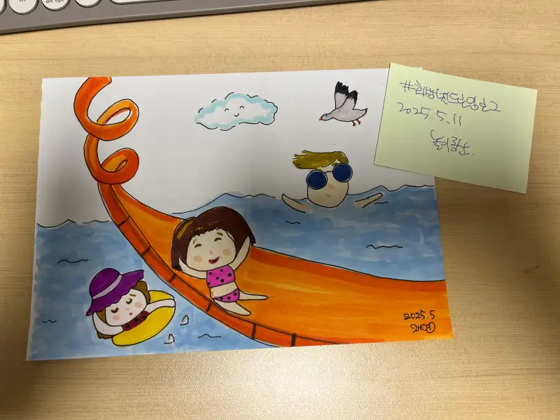 워터파크의 미끄럼틀과 바다를 상상하며 갈매기도 그려보았습니다.