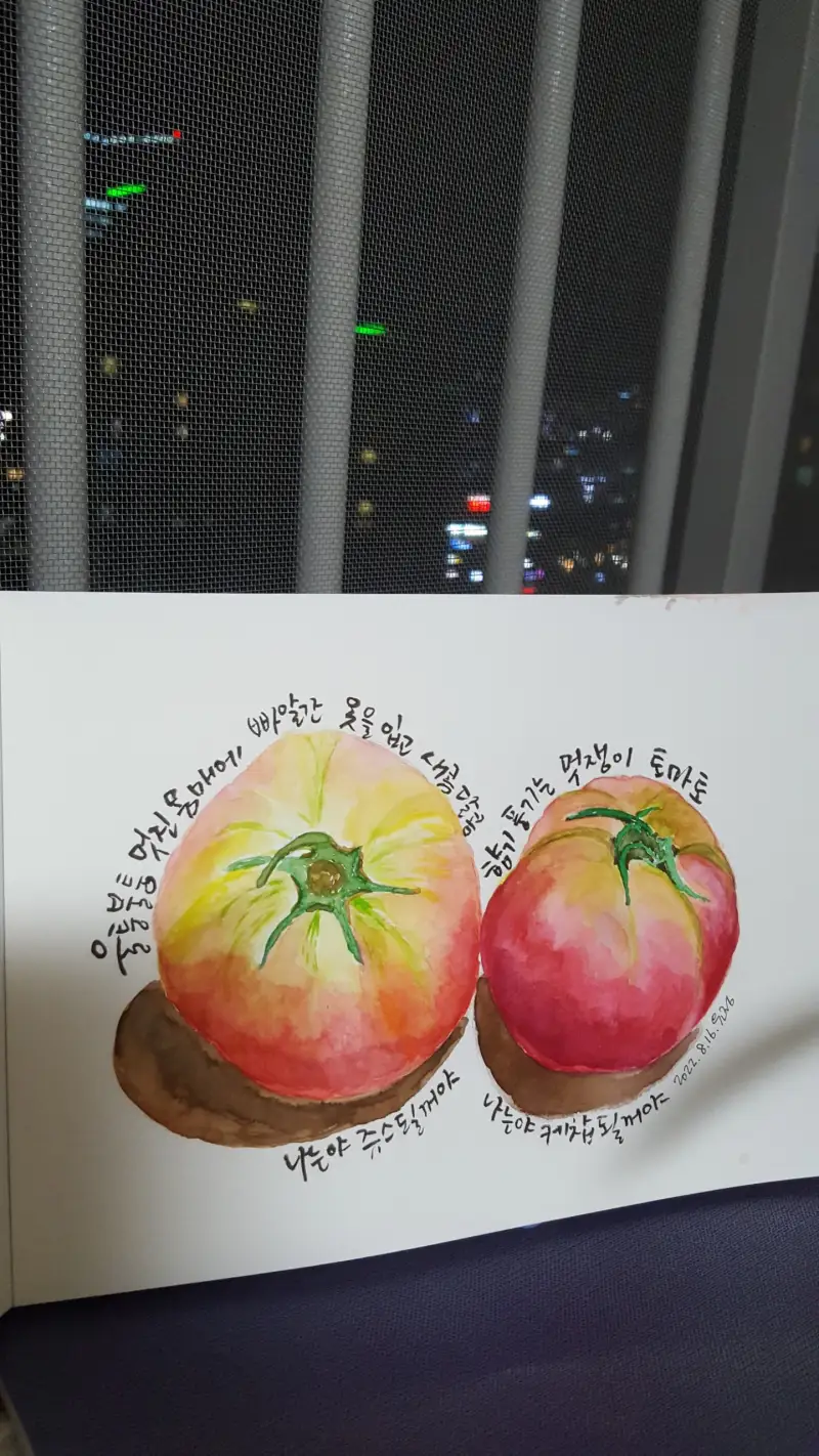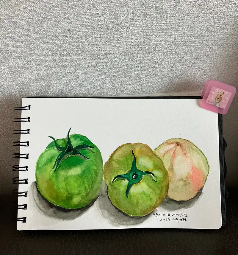 어렸을때 엄마가 여름이면 설탕에 절인 달콤한 토마토도 좋아한답니다. 그래서 토마토를 그려봤어요.