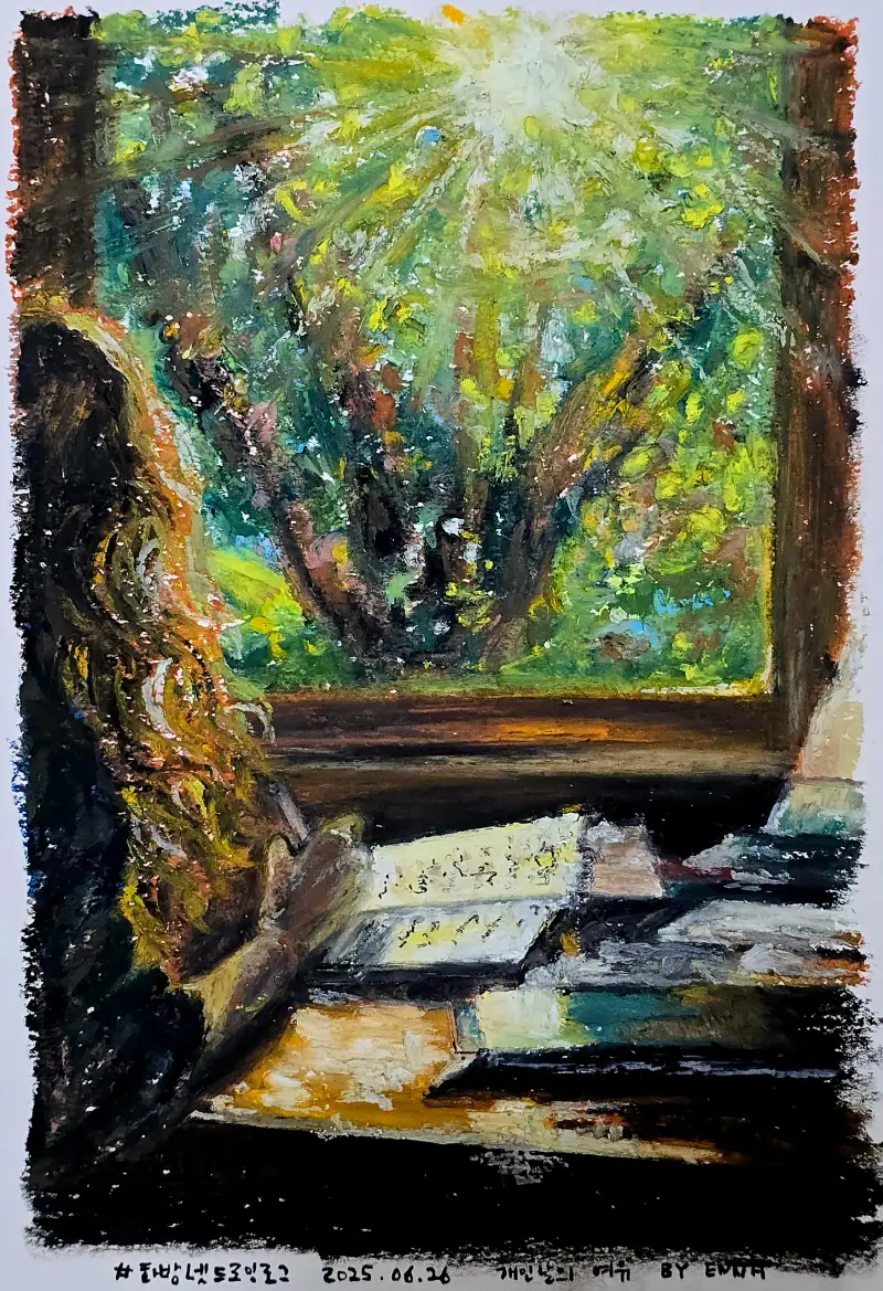 유리창 너머로 쨍하게 해가 비치며, 바깥으론 푸릇한 나무들이 보이는 맑게 개인 날의 여유!