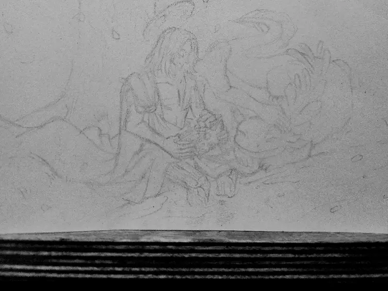 스케치 과정을 찍은 사진 입니다. 스케치 선이 잘 보일 수 있도록 흑백으로 사진을 보정하였습니다. 빅토르가 벚나무 아래에서 어린 시절 자신이 만든 오래된 장난감 배를 들고 "리오" 라는 이름을 가진 우파루파를 닮은 동물과 함께 휴식을 취하는 모습을 상상하여 그려보았습니다.