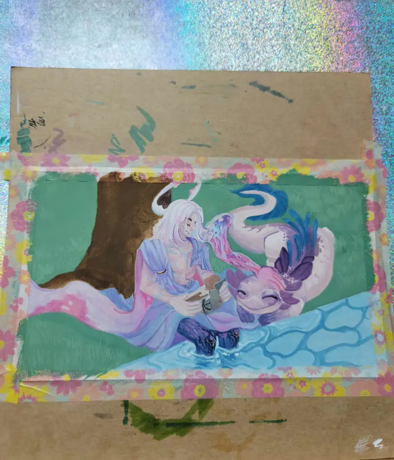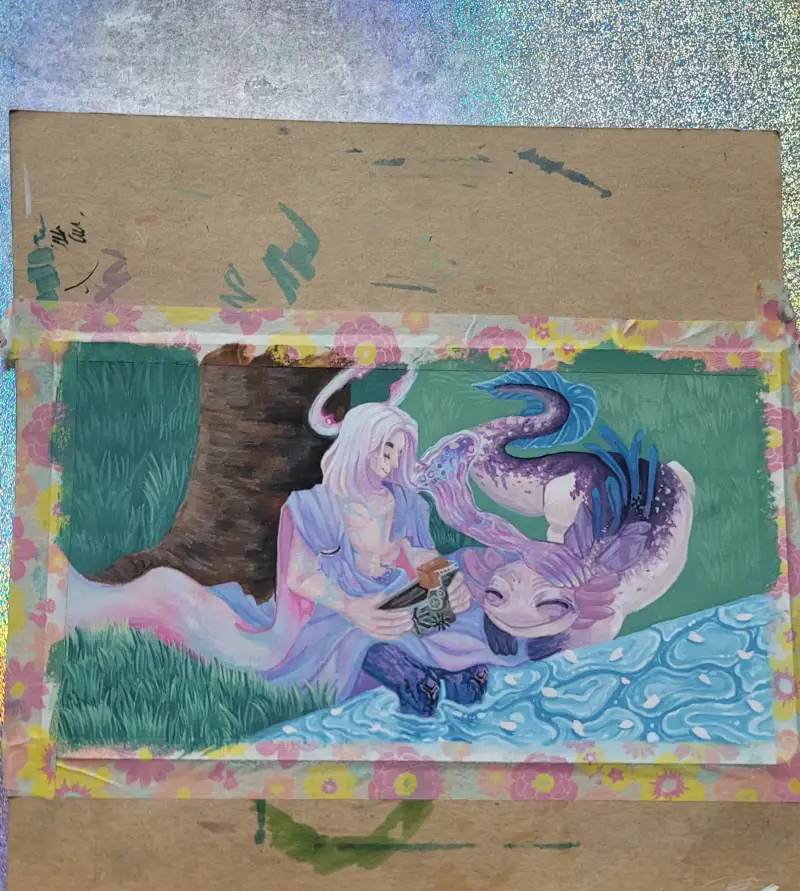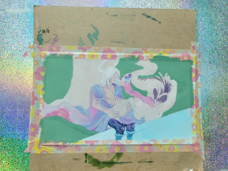 인물을 비롯한 대부분의 면을 채색하고 본격적으로 묘사를 시작할 때에 찍은 사진 입니다. 풀이나 나무,개울이나 연못의 물결 묘사는 평소에도 잘 그리는 대상이 아니다 보니 묘사에 어려움을 느끼곤 했는데, 수채 과슈 라는 새로운 재료의 시도로 인해 더더욱 어려움을 겪었습니다😭