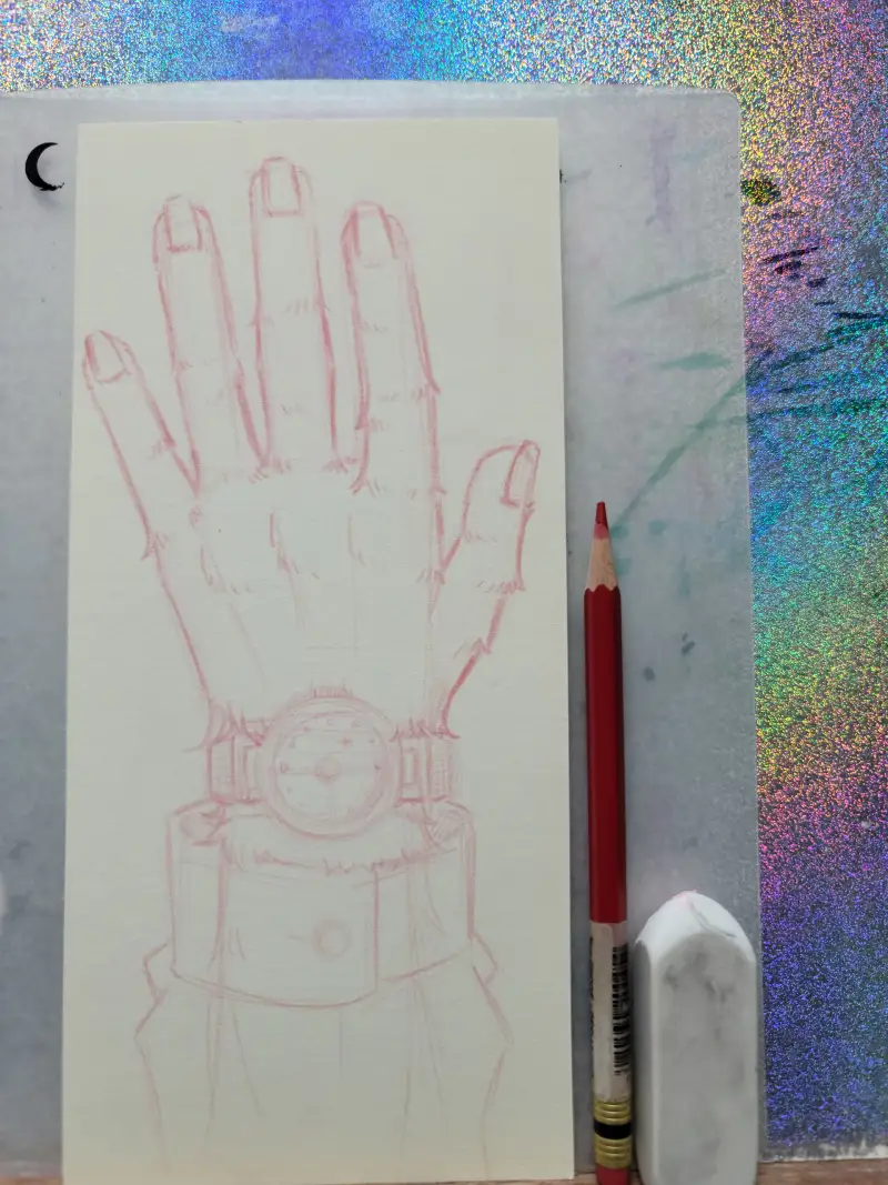 먼저 스케치 과정을 찍은 사진 입니다. 떡지우개로 연하게 지워 형태가 보일 정도로만 놔둔 후, 채색합니다. 빛이 어디로 뿜어나가는지,  어떤 부분이 어두운지 약하게 나마 표시도 해두었습니다.