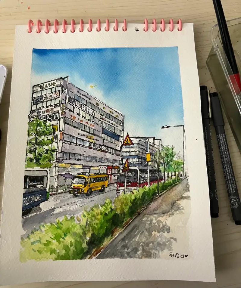 우리동네 어떤부분을 그려볼까 여기저기 사진도 많이 찍고 하다가 자주 거니는 거리를 그려봤습니다