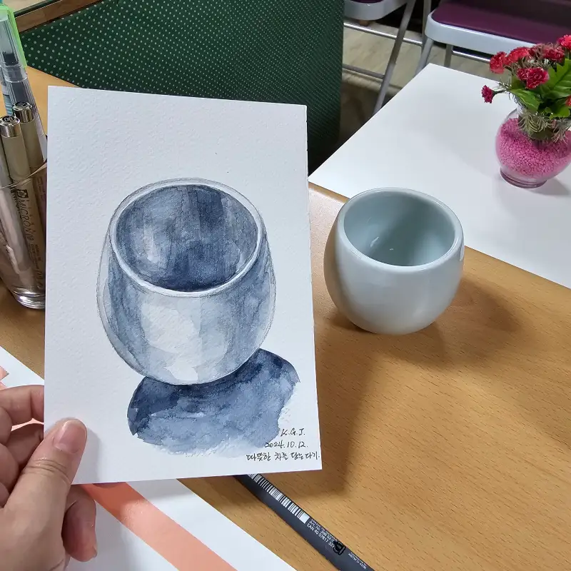 갑작스런 날씨 변화로 감기가 와버렸어요.ㅠㅠ 힘내기가 힘들어서 어떻게 할까 하다가 겨우 따뜻한 차 한잔 마시고 그려봅니다. 나의 건강을 위해 두툼한 도자기컵에 따뜻한 차 한잔 마셨어요~♡