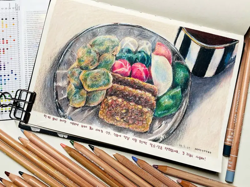 명절 아침으로 먹은 모닝떡 색연필로 그리기