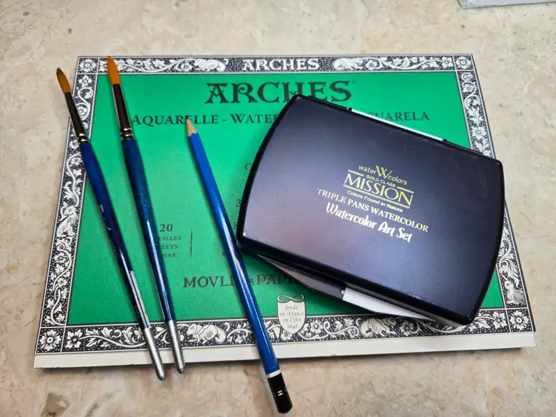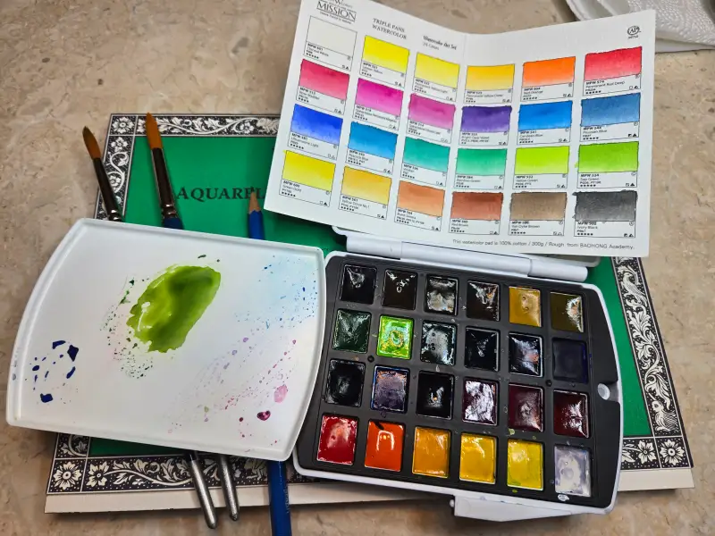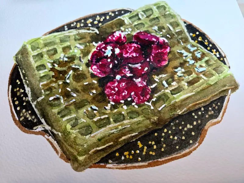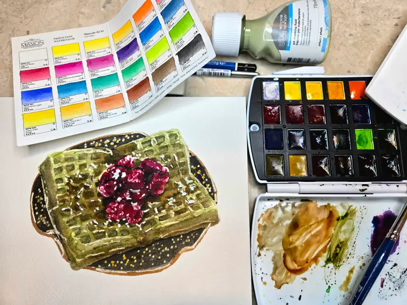화방넷에서 구입한 미젤로 미션 골드클래스 수채화 고체물감 24색 (이름이 너무 길어요.. ㅋㅋ)으로 명절때 카페가서 먹은 쑥인절미와플을 그려봤어요~