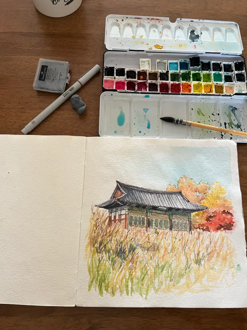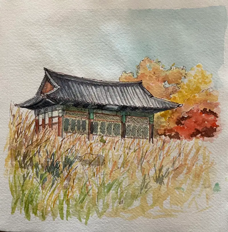 보광사 가을풍경 . 기와를 그리는게 역시나 어려웠어요. 단수하게 쉽게 표현하려했으나 항상 손이 헤매다 무엇을 생략하고 무엇을 강조 할 지를 잊고 마네요. 깔끔하게 그리고 싶었으나 오늘도 역시 헤매던 붓 질이 맑고 깨끗한 수채화 느낌을 살리지 못 했어요. 그래도 go~