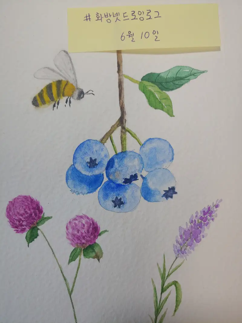 블루베리만 그렸다가 뭔가 허전해서 벌도 그리고 꽃도 그려넣었어요. ㅎㅎㅎ 벌 예쁘게 그리고 싶은데 어려워요. ^^;;