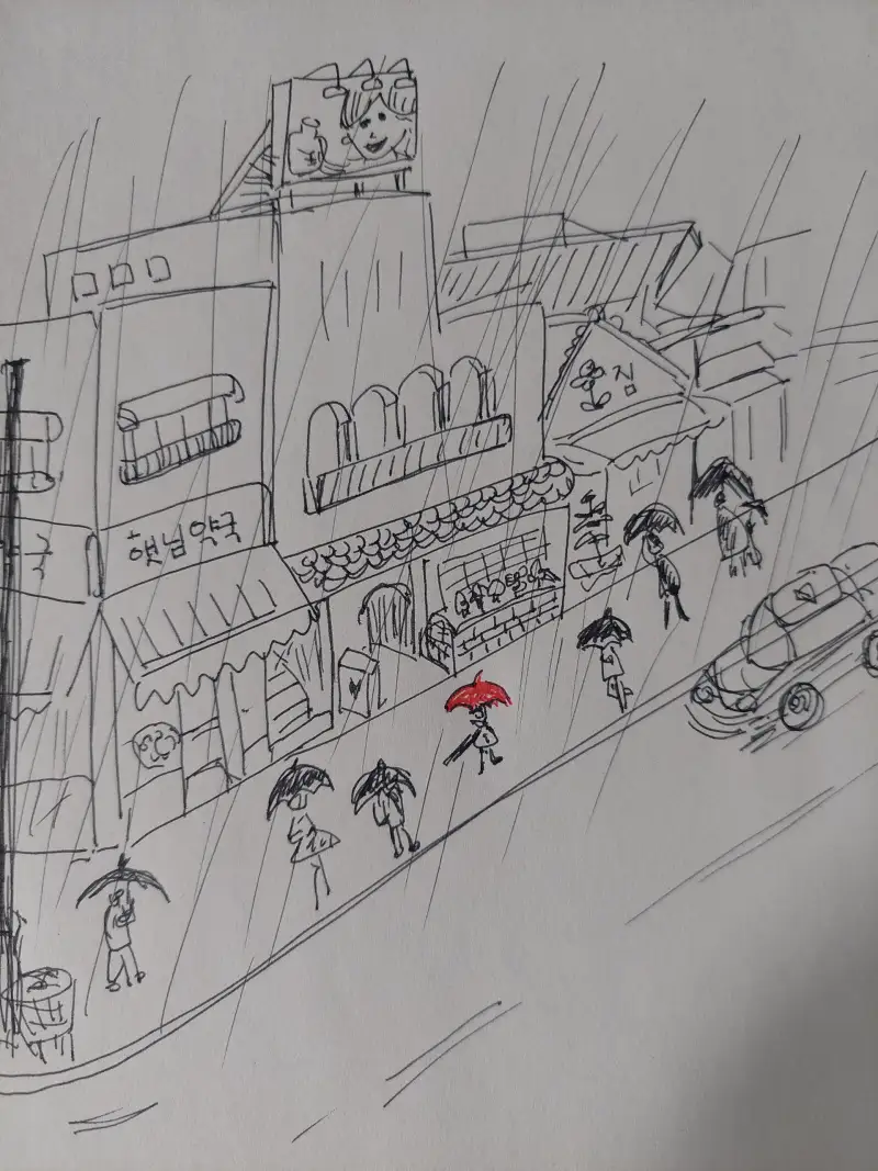 흑백그림속에 우산만 빨갛게 그려진게 재밌고 인상적인 따스한 그림책이예요^^