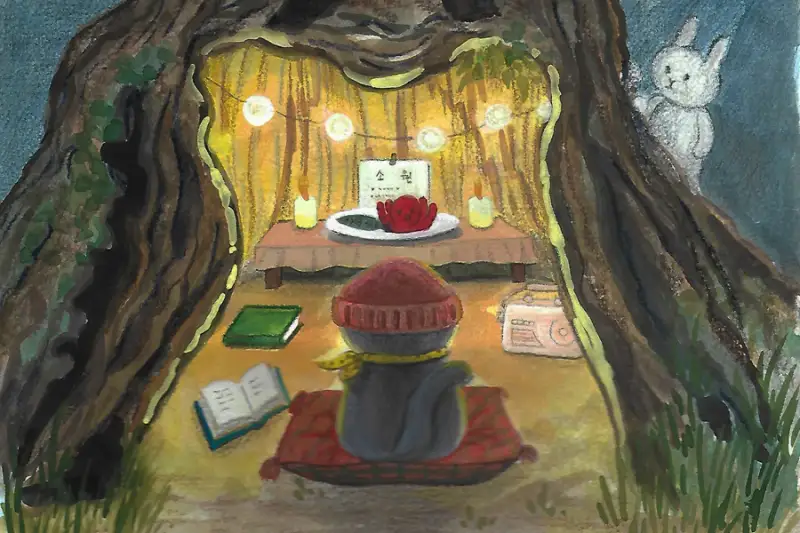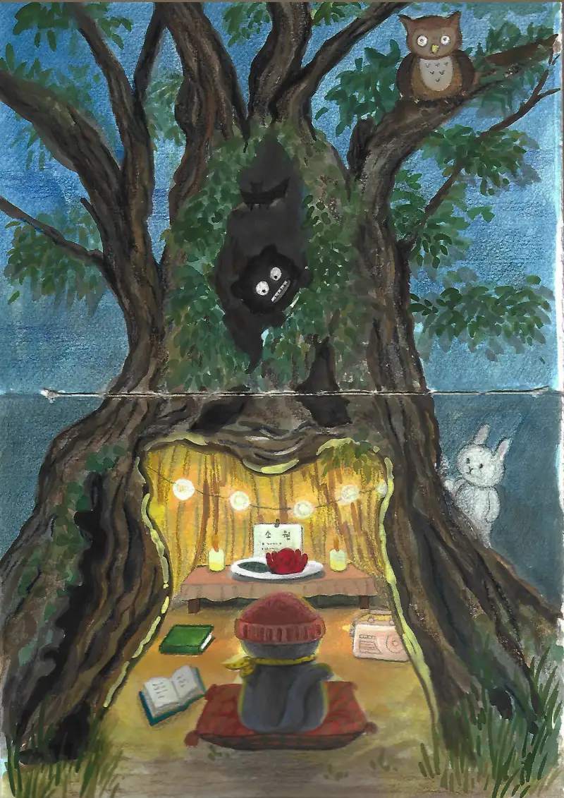 히가시노게이고의 "녹나무의 파수꾼" 속 녹나무와 소원을 비는 사람...이 아닌 냥이의 모습을 그려봤어요.