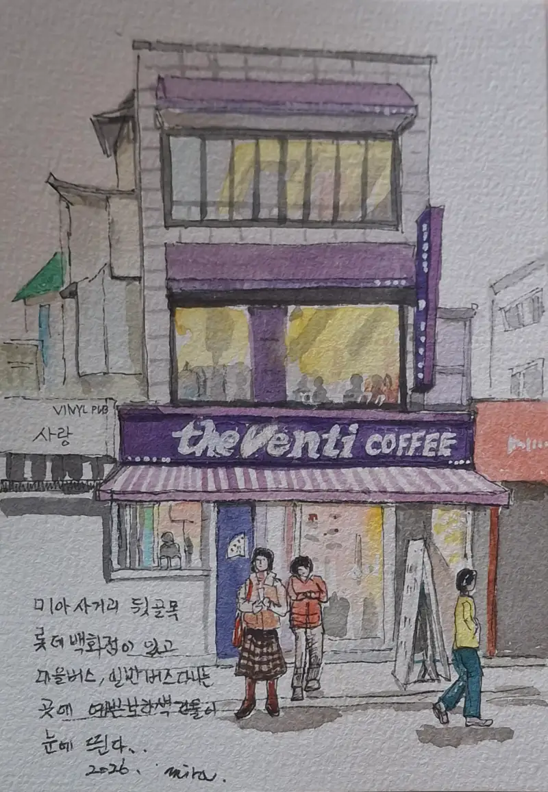 미아 사거리 뒷길이지만 마을버스와 일반버스가 다니는 넓지않은 길에 보라보라한 예쁜 카페가 있어요. 지나다니며 볼때 마다 한번 꼭 그려보고 싶은 곳이었어요. 마침 카페그리기 챌린지 덕분에 드디어 그려봅니다.