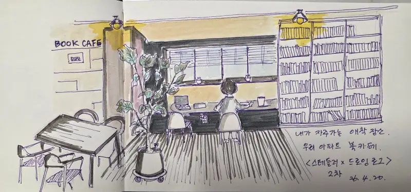 스테들러-드로잉로그 2차 작품으로 내가 가장 자주가는 우리 아파트 북카페를 그렸다. 북카페에 가서 커피도 하나 뽑고 그림도 그리고, 이것저것 책도 읽고.....조용히 있고 싶을 때 자주 간다. 가보면 사람이 없거나 1~2명 정도 각자 노트북 켜고 뭔가를 한다....난 여기에서 그림 그리는 것이 너무 좋다..^^ 스테들러피그먼트 라이너는 얼마전 구입했는데...펜드로잉 할 때 명암을 나타내거나 할 때 아주 유용하게 쓰인다. 매번 이런저런 채색을 했었는데....이번엔 이 라이너를 이용해서 밝고 어두움을 표현하고자 했다.