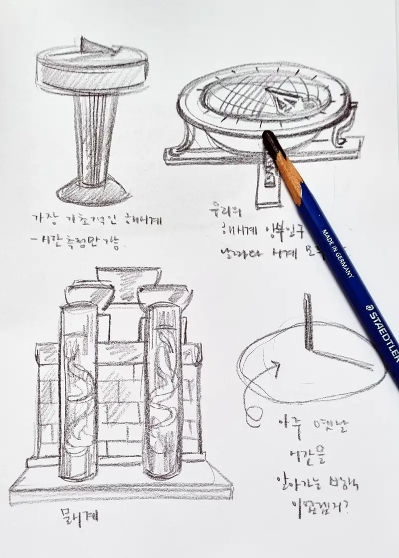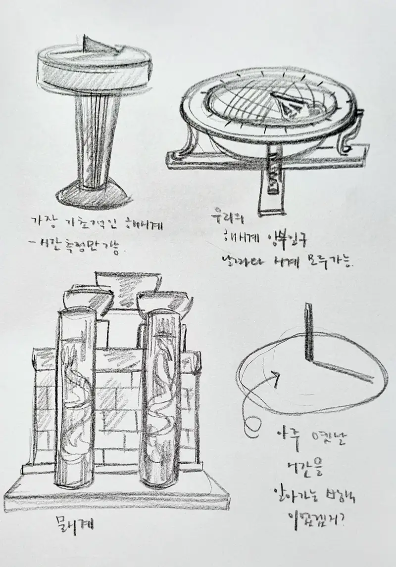 물시계. 해시계, 옛날 작대기 시계 등등을 그려보았습니다.