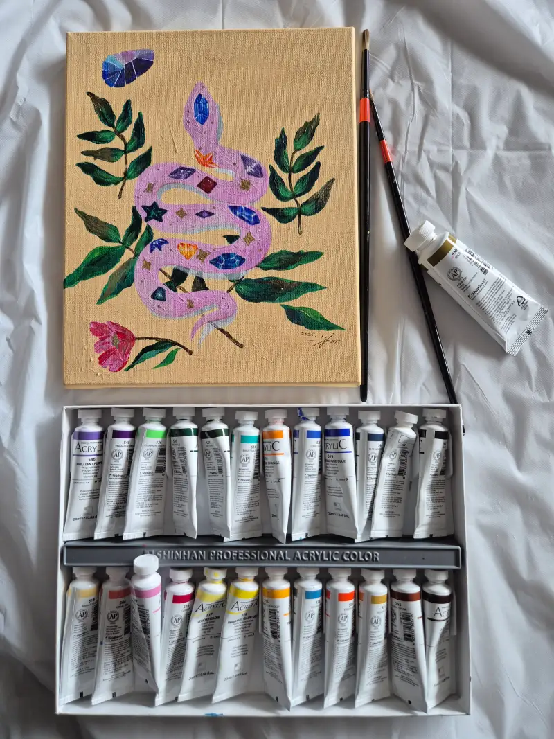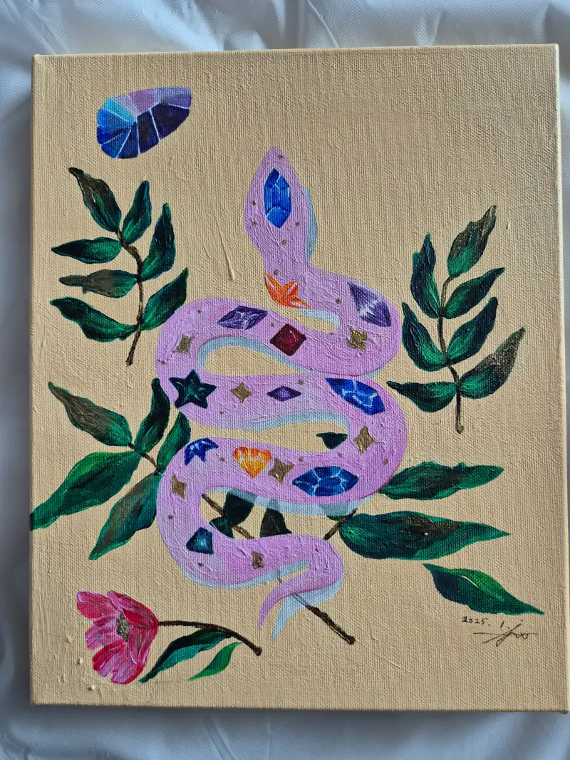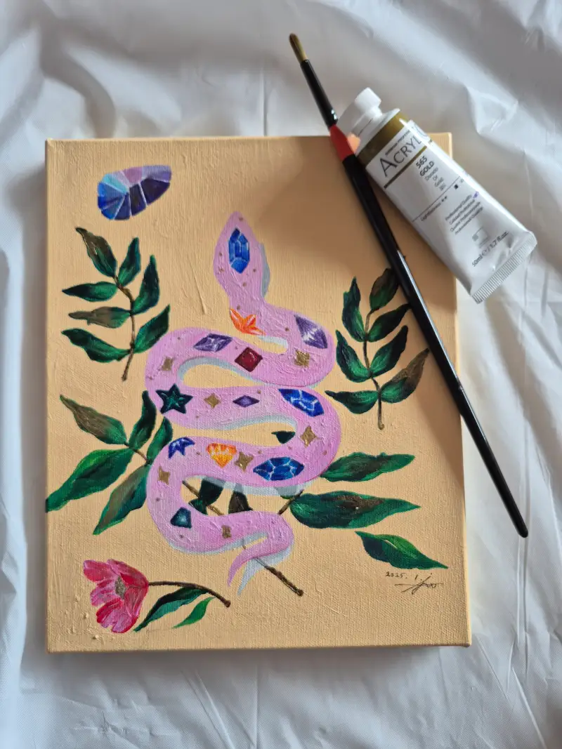 뱀띠 늦둥이 딸이 6학년이 되어 앞으로 빛나고 지혜로운 사람이 되라는 기원을 담아 그렸어요. 반짝임을 표현해보려고 골드아크릴 물감을 사용했는데 펄이 있어서 발림이 어려웠어요.