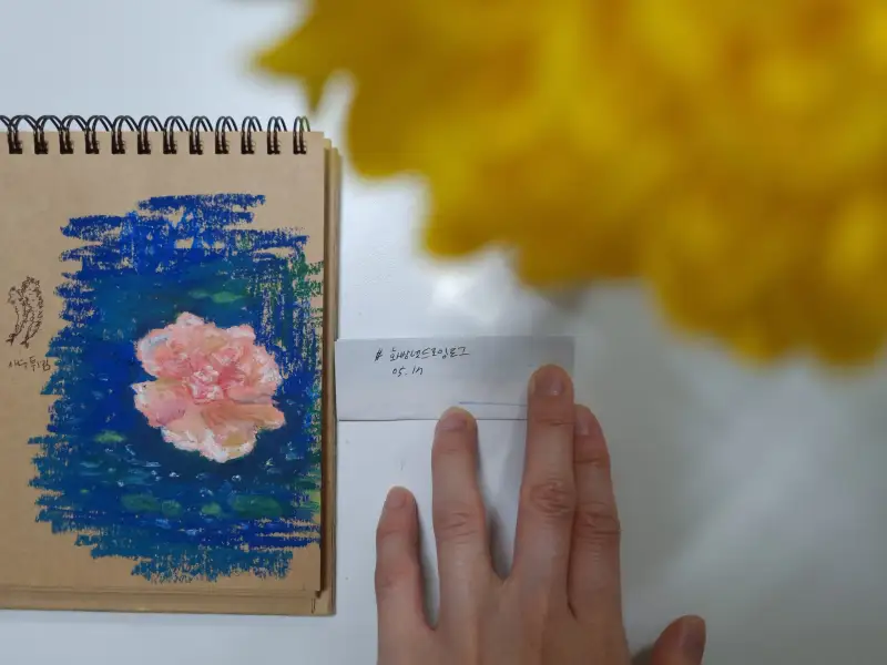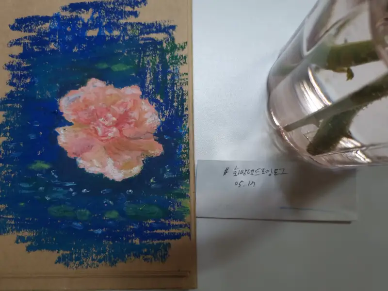 핑크와 카네이션을 제가 선물로 드린 기억이나서 그렸구요~ 핑크와 물결이 생각나서 파란색감으로 칠해봤어요