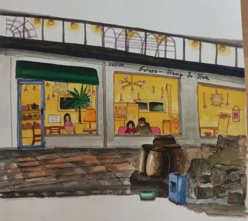 카페능소화입니다. 해가지기시작할무렵 카페안 아늑한 불빛이 맘에들어 그려보았어요. 따뜻한 느낌이 들어서 좋았답니다.
