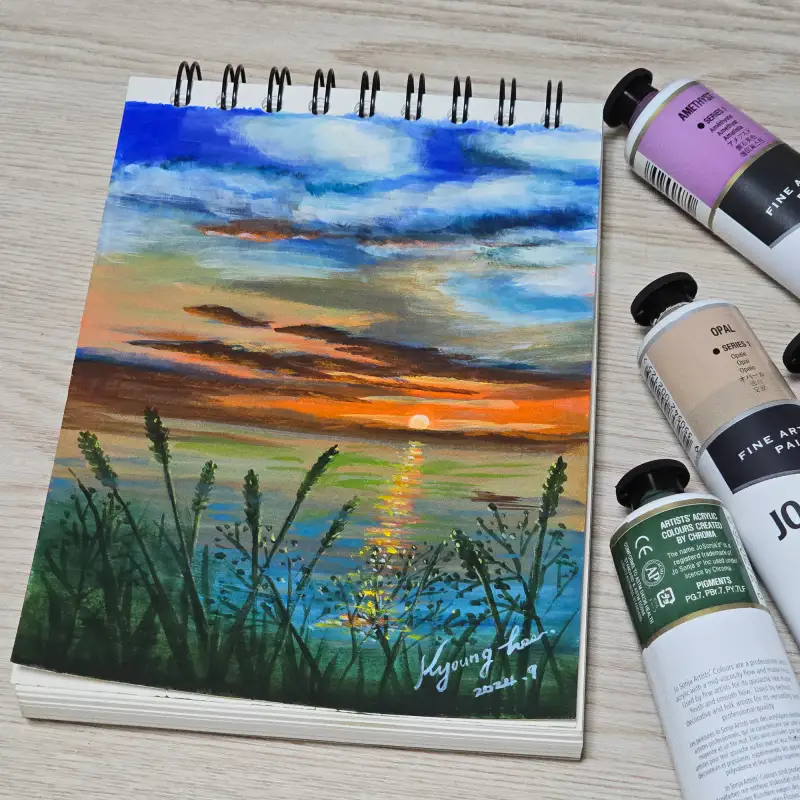 해질녘에 쏟아지는 빛의 무수한 조각들 하늘과 물위를 수놓고 있어요