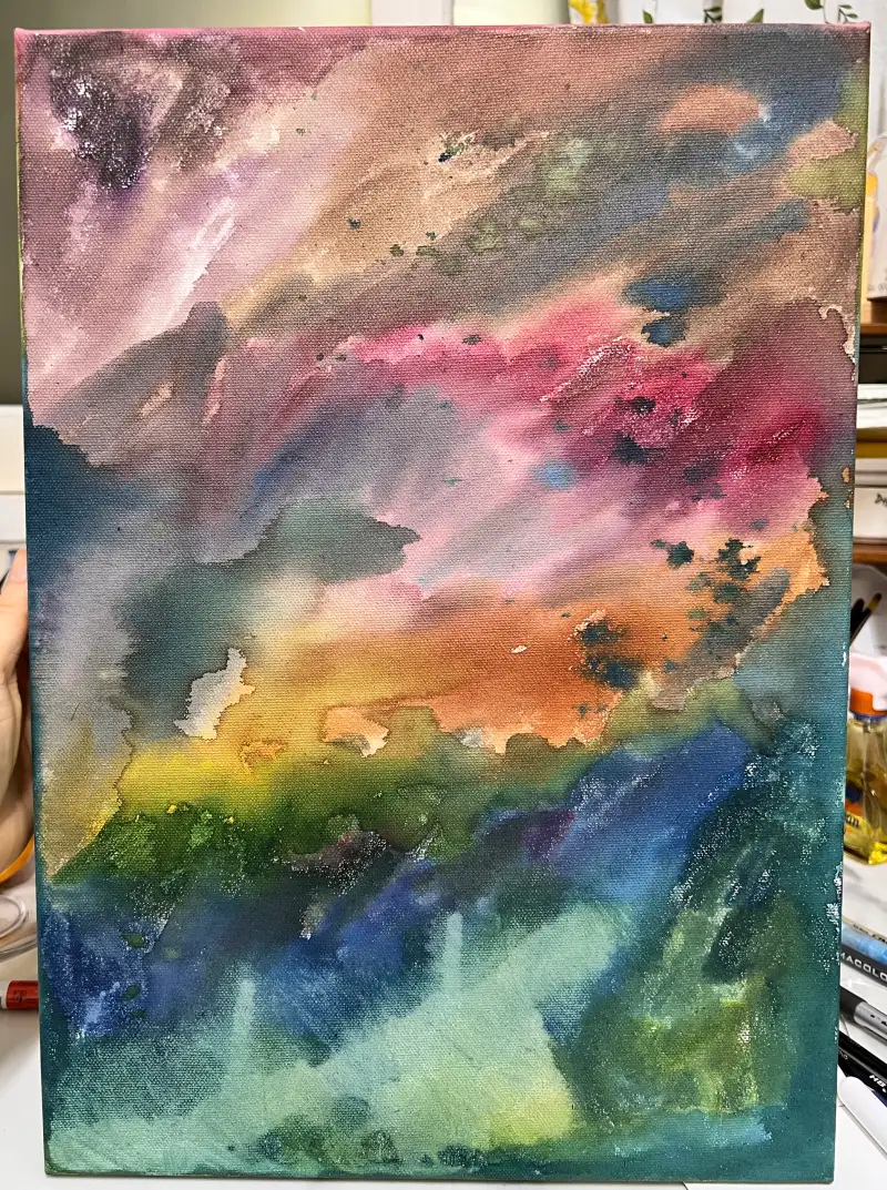 배경을 투명한듯 불투명한듯 신비롭게 하고싶어서 캔버스에 수채화로 깔았더니 ...지우면 복구가 안되어서 스케치를 틀리지 않게 하려고 무척 애썼어요 ㅋㅋ ,,ㄷㄷㄷ (저 떨렸어용 )