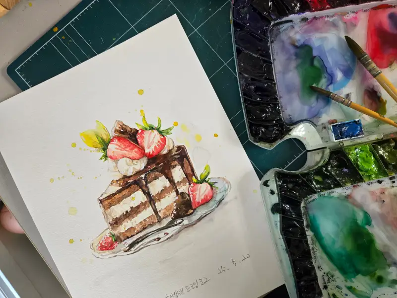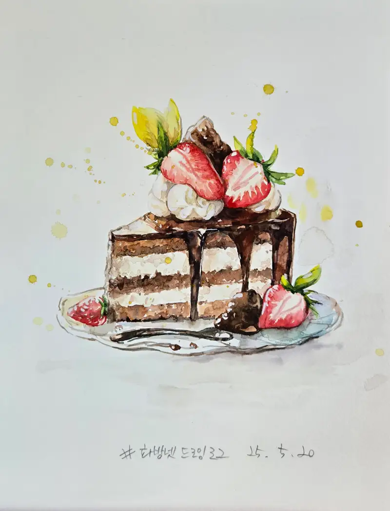 3주차 주제는 케이크라서 여러가지 다른 재료보다는 조각 케잌을 수채화로 맛나게 그려보고자 했습니다..음식을 수채화로 잘 안그려봐서 조금 어색하지만 이번기회에 그려보게되어 넘 좋았습니다..