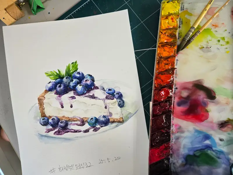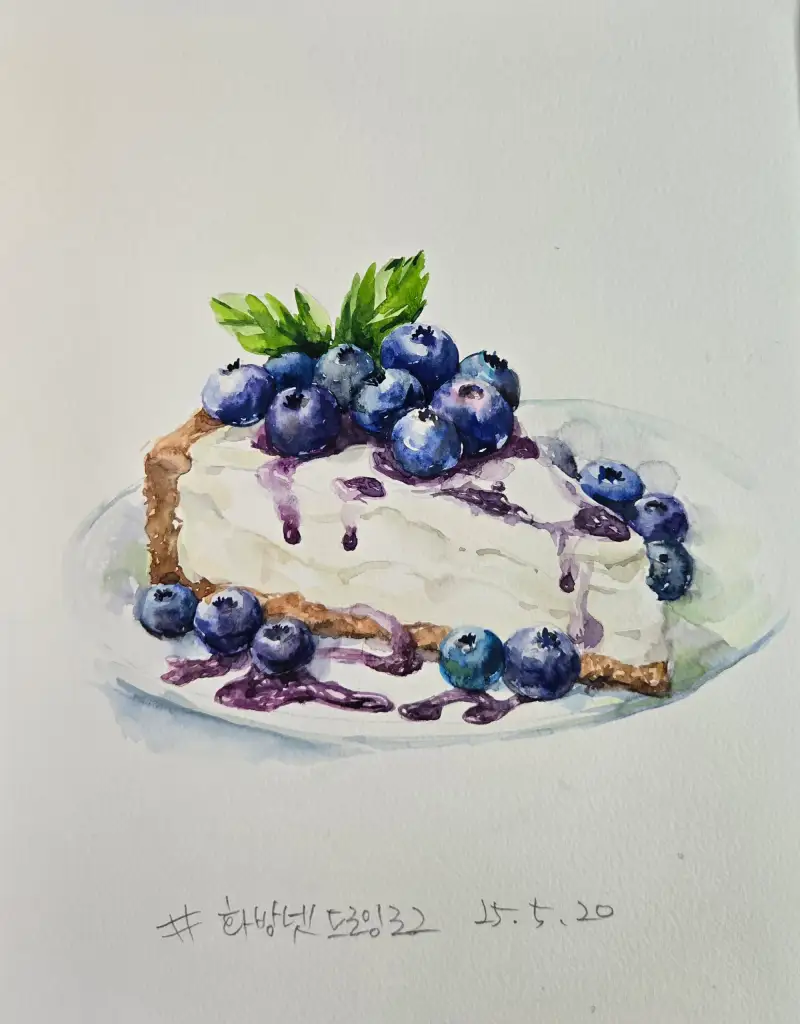 화방넷드로잉로그 마지막 작품이네요 ㅎㅎ 두번째 그림은 제가 좋아하는 블루베리 케잌을 그려보았습니다..두번째 그리는거라 처음보다는 조금 더 자연스러워졌네요..음식을 수채화로 그려보는 것도 아주 재미난 작업이네요..참고로 사용한 수채물감은 미젤로 미션골드 제품이네요^^색이 선명하고 이쁘게 잘 표현됩니다..붓은 바바라650R 제품으로 물머금도 좋고 자세한 표현이 가능해서 만족하며 사용하고 있어요