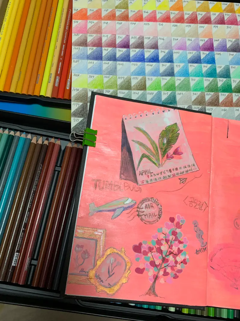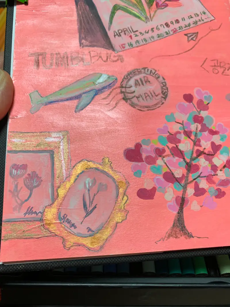 바닥배경은 아크릴 물감으로 필했고 위에 과슈와 유성색연필로 마무리했어요. 그리고 시넬리에 오일파스텔 펄셋트에 골드, 브론즈 색으로 반짝임 줘봤어요.