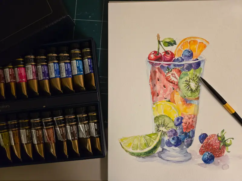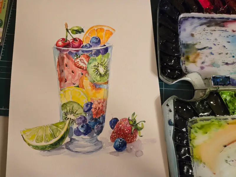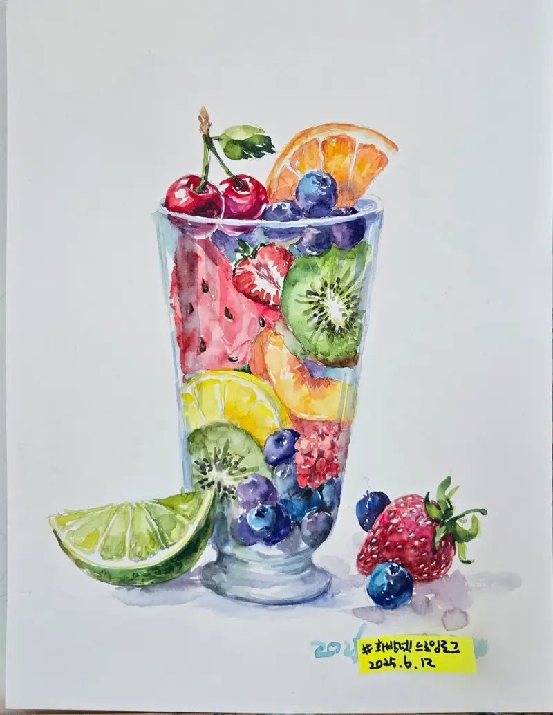 드로잉로그 1주차 주제인 과일 두번째 그림^^은 제가 좋아하는 과일들을 모아 유리컵에 담아보았습니다. 수채물감은 제가 너무좋아하는 미젤로 미션골드 입니다..색감이 선명하고 발색이 좋아 항상 사용하는 제품이네요.지인들에게도 추천하구요.채색후 시간이 지나면 더 이뻐지더라구요^^