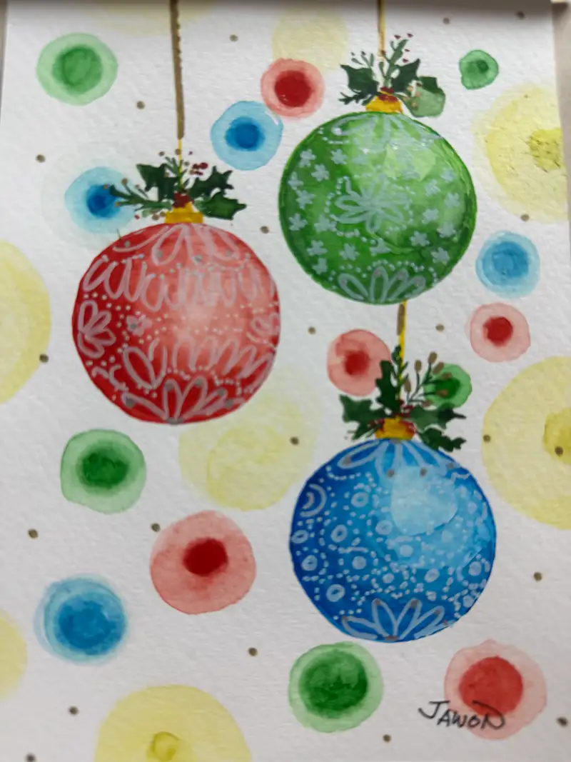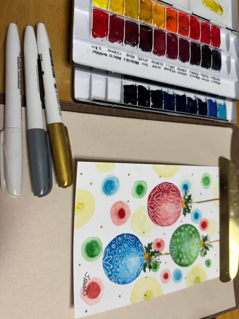 홀베인수채 물감을 병뚜껑에 발라 동그랗게 찍고 색 유리 구슬을 그리고 모나미네임펜 흰색은색 금색으로 무늬를 그렸지요. 알록달록 색색의 조명들도 그려 넣어 주었습니다. 그림으로 크리스마스가 성큼 다가옴을 느끼네요.