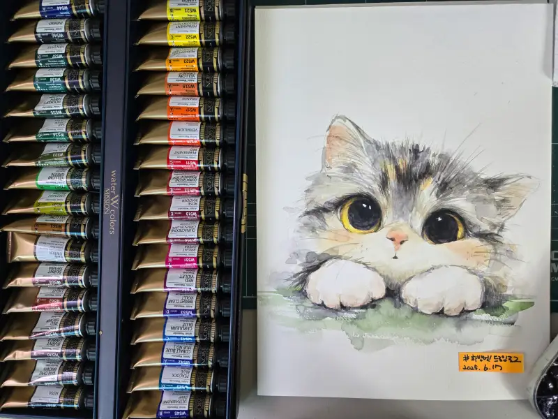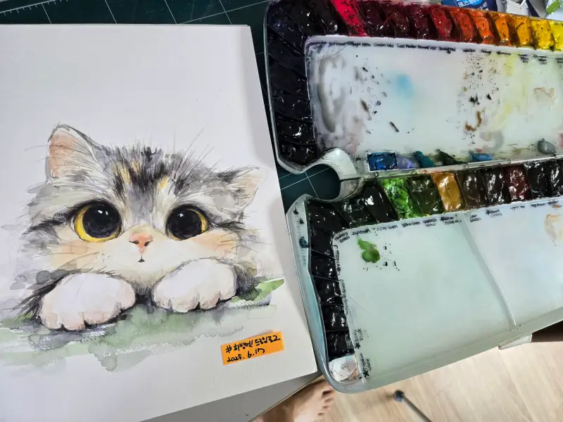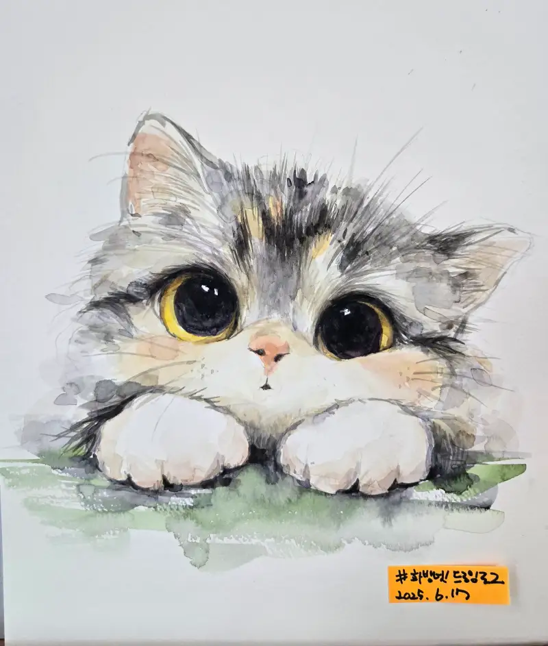 화방넷드로잉로그 9기 2주차 주제가 동물이네요^^예전에 장화신은 귀여운 고양이가 문득 생각이 나더라구요 ㅎㅎ 미젤로 수채물감의 산뜻하며 자연스런발색력이 그림의 주제를 더 잘 표현할수있게 해주네요^^