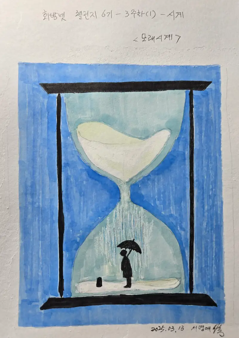 그 안에서 모래시계 속에서 흘라가는 시간속의 시계를 그려봤어요.