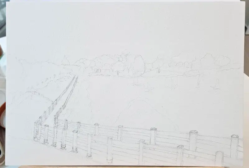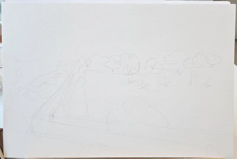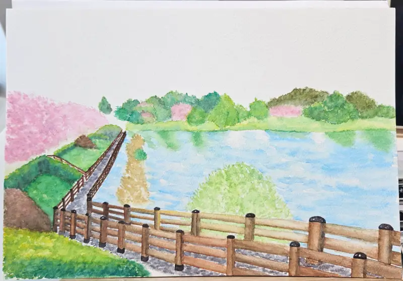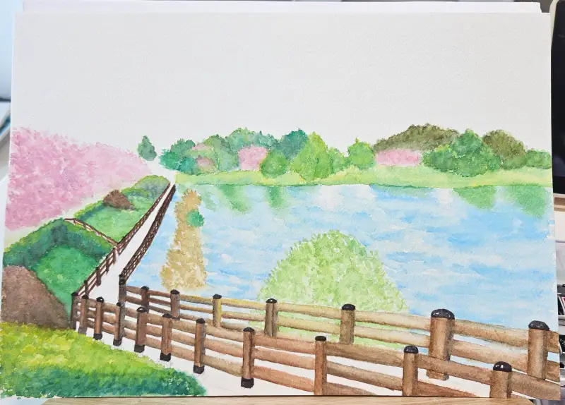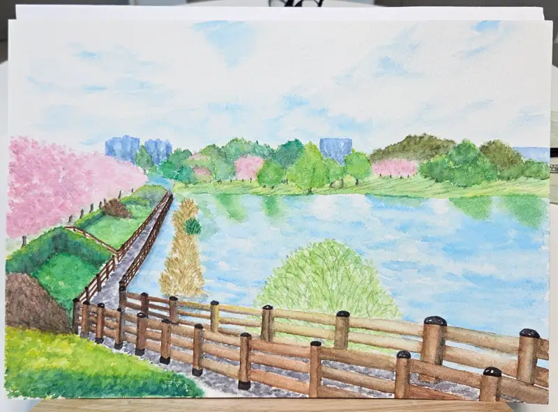 이번엔 좀 큰 그림을 그려보자!하는 마음으로 저수지 공원 풍경을 그려봤습니다.