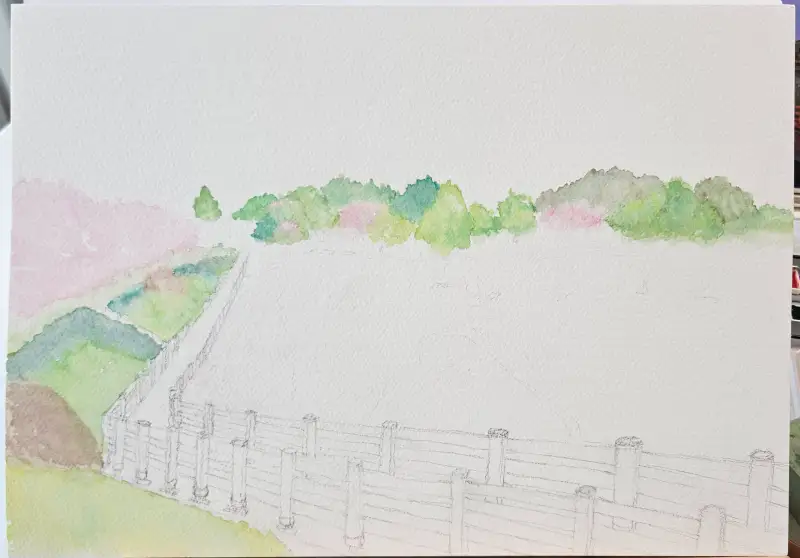 2차로 짙게 색을 넣었어요. 식물들을 대충 다 칠해줘서 이제는 데크로 넘어가요.