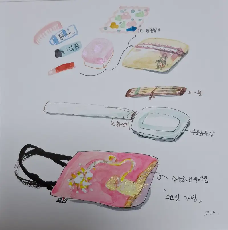 수요일 수묵화 수업가방 입니다. 무거운것은 학교에 놓고 다니고 가벼운것은 집에서 혹시 연습할까 하고 가지고 다니지만 역시 못 하고 그냥 그대로 가지고 갑니디.