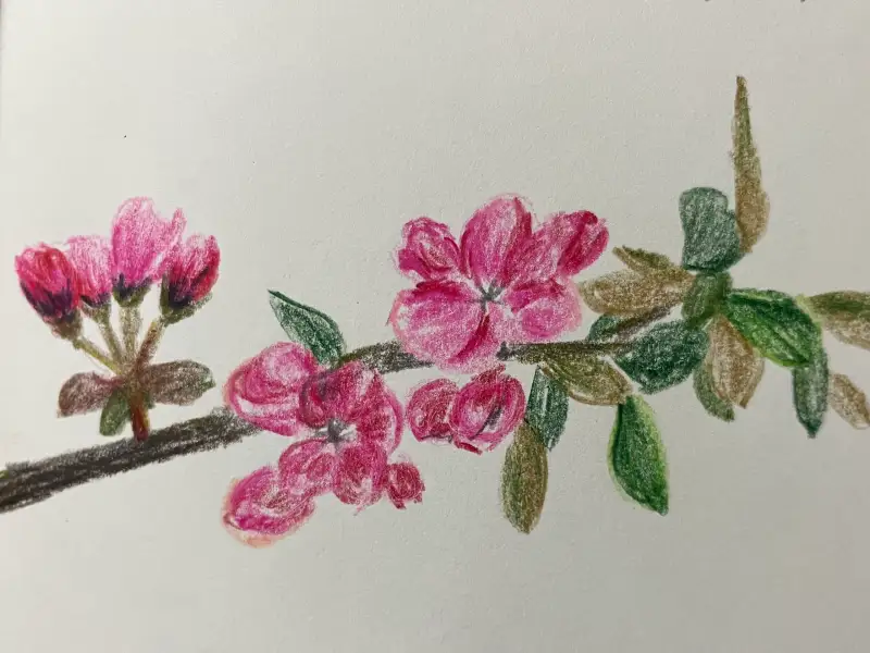벚꽃인 줄 알고 사진 찍어놓고 보니 복사꽃이었다. 벚꽃은 아니지만 비슷한 시기에 나는 이 벚꽃 친척도 그냥 지나칠 수 없어 그려보았다.