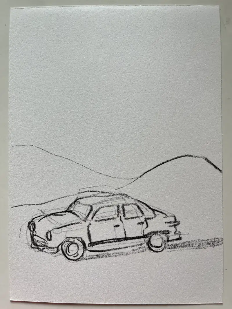 사막 한 가운데 차 연료가 떨어지고 차가 망가져서 멈추게 된 상황.