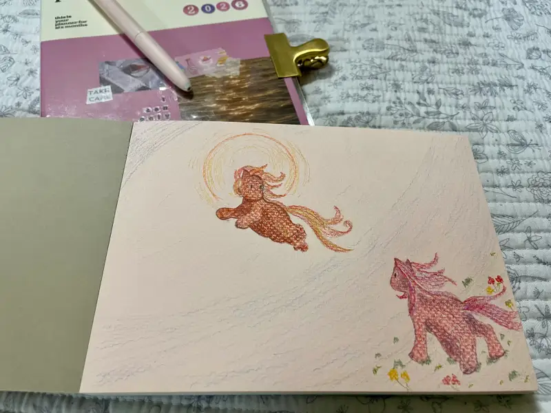 전에 맞이했던 말의 해에도 앞장에 볼펜으로 이런 그림을 그렸던 게 기억나서요! 그때는 아마 백마의 해라 유니콘을 그렸던 것 같은데, 올해는 적마라고 하니 태양을 향해 날아오르는 말 친구들을 그렸습니다 :)