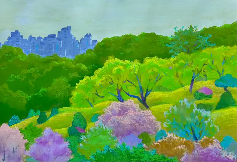 저희 집 거실에서 베란다 쪽을 보면 이런 풍경이 보이네요. 다양한 녹색과 붉은색이 조화를 이루는 근경의 평화로운 자연, 멀리 보이는 아파트. 새로 산 재료인 오일파스텔(까렌다쉬)로 그려 보았습니다. 처음에는 아크릴물감(신한)으로 단순하게 색면처럼 밑칠하고 연필(스테들러)로 형태를 스케치한 다음, 오일파스텔로 나무의 질감표현을 더하며 느낌을 내보았습니다. 처음 쓰는 재료라 쉽지 않았지만 풍경을 보고 느낀 제 인상은 비슷하게 담은 것 같습니다.