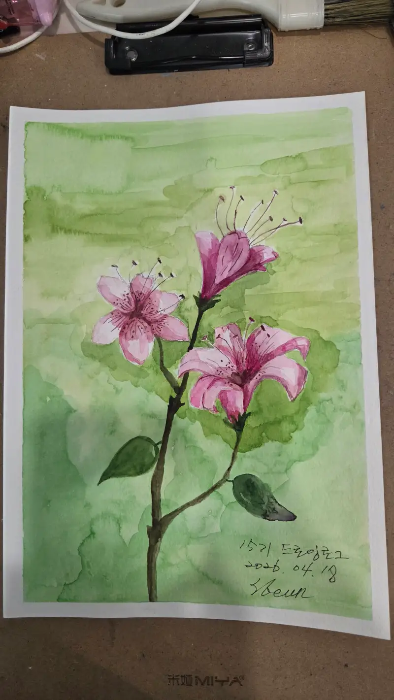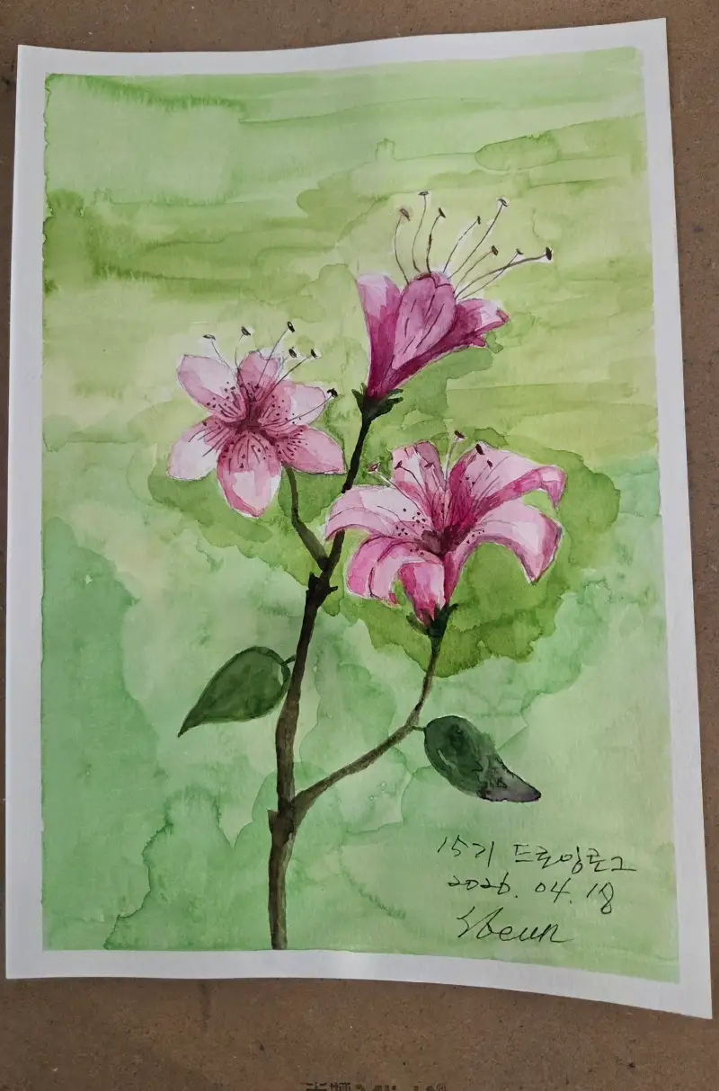 벚꽃 말고 철쭉을 그렸습니다. 꽃은 스케치도 어렵고 채색도 만만치 않아서 그리다 포기하길 반복하다 겨우 완성했습니다.