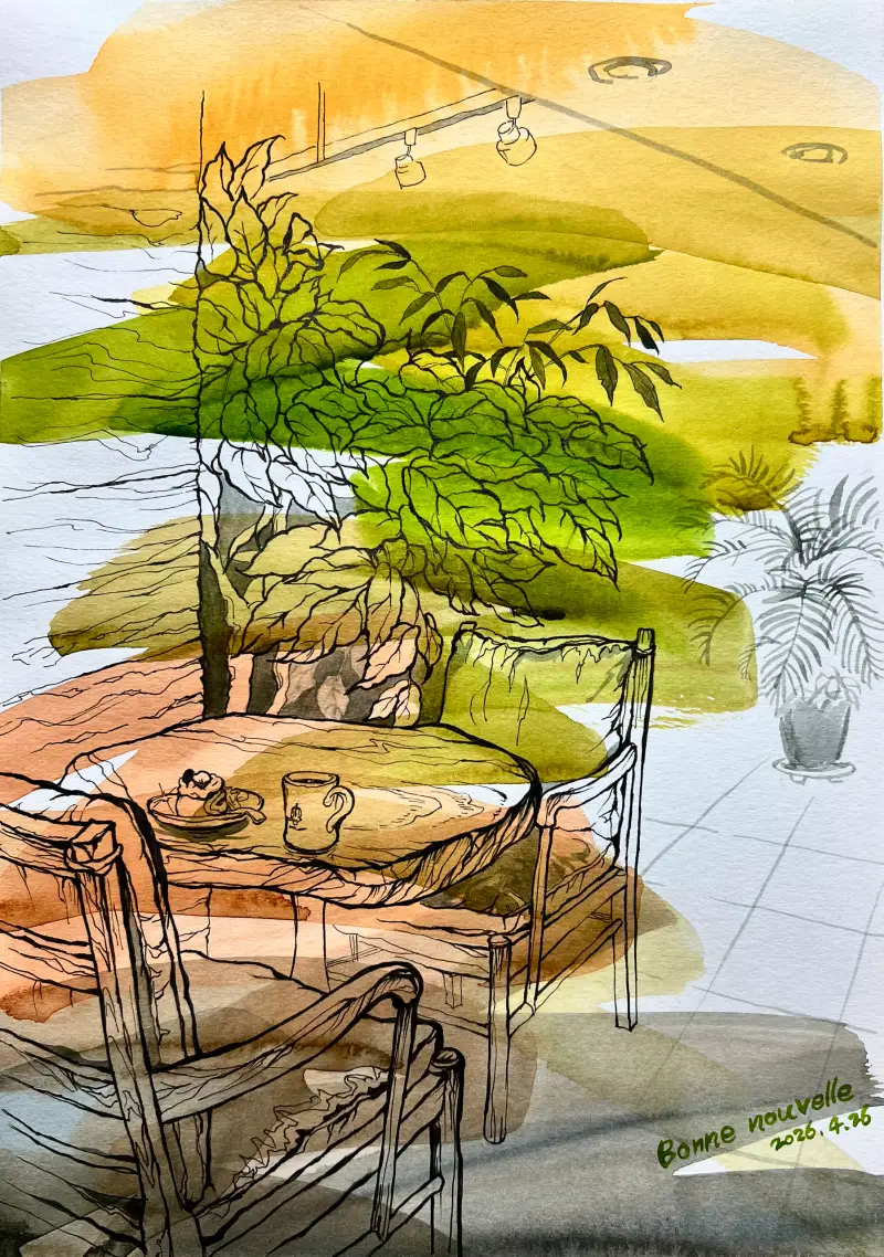 지난 화요일에 여기서 남미 여행다녀오신 이모의 흥미로운 여행담을 들었어요. 마추픽추, 이과수 폭포, 우유니 사막 등.. 사진만 봐도 좋더군요. 식물의 형태와 가구의 질감을 강조해서 카페 내부를 그려 보았어요.