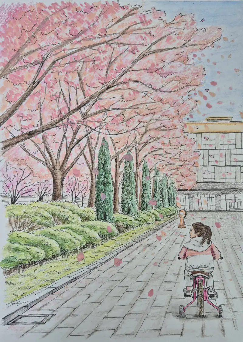 벚꽃비가 내리는 4월의 어느 날, 자전거 타는 딸아이가 봄을 느끼는 풍경을 담아보았습니다.