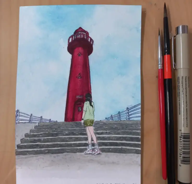 등대가 있는 바다로 바람쐬러간 언니의 사진을 보고 그렸다.