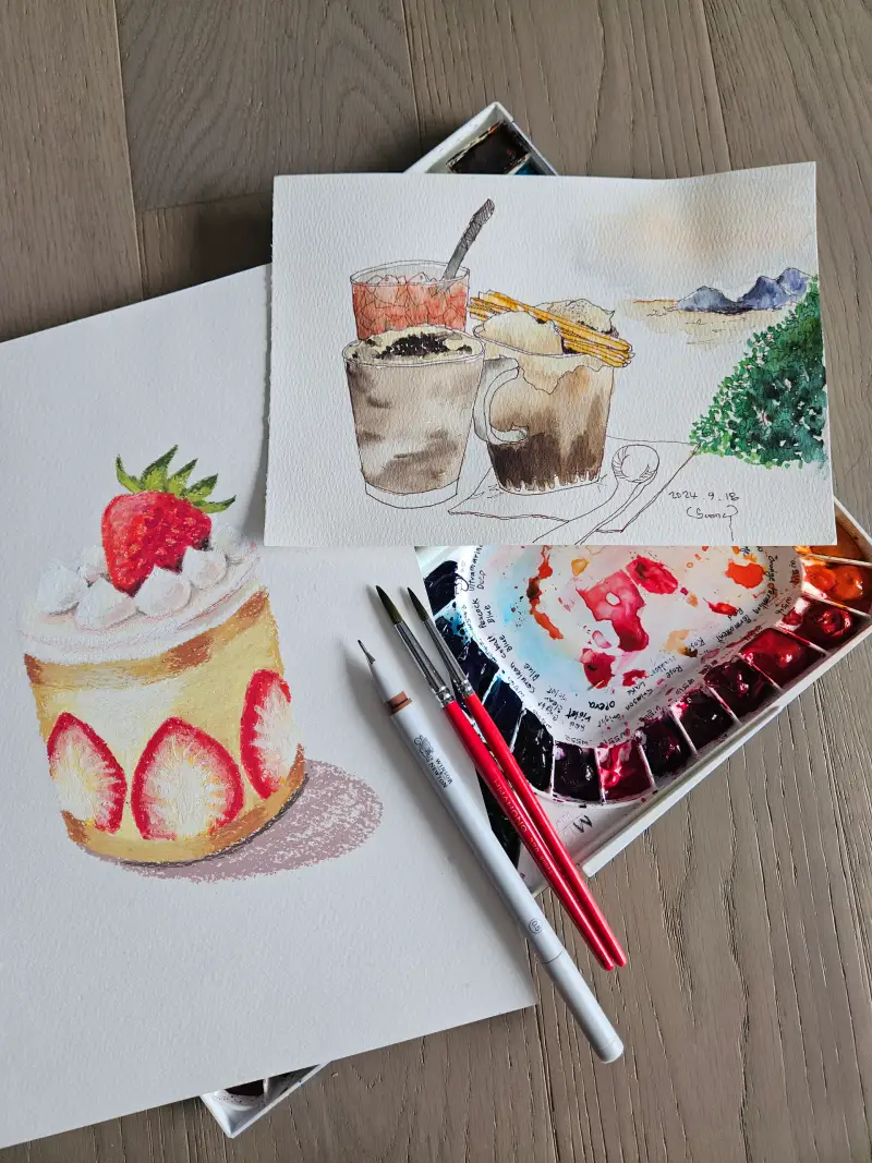 #보테가카페#노을맛집#츄로슈페너#마약뽕라떼#아아#딸기케잌#화방넷#화방넷드로잉로그#미젤로수채물감#winsornewton0.5#화홍붓#문교오일파스텔