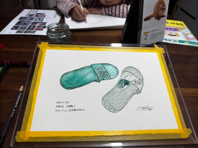 그리고 수성색연필로 대충 기본색을 채색하고 붓에 물을 적셔 슬슬 터치를 해주었습니다.