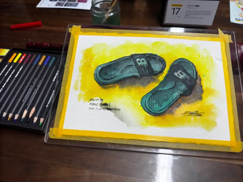 오눌은 회사에서 조굼 늦게 퇴근을 해서 잘 사용하지 않는 도구인 까렌다쉬 뮤지엄아쿠아렐 수성 색연필을 사용했어요.