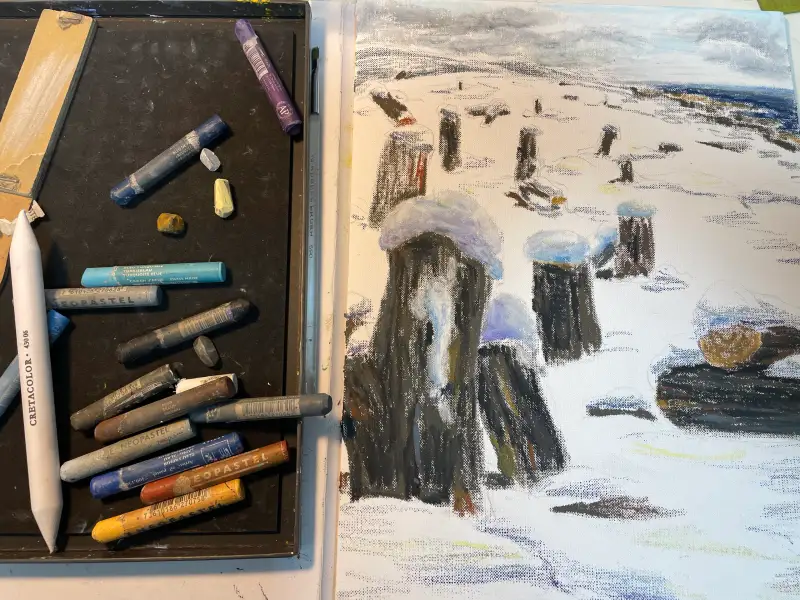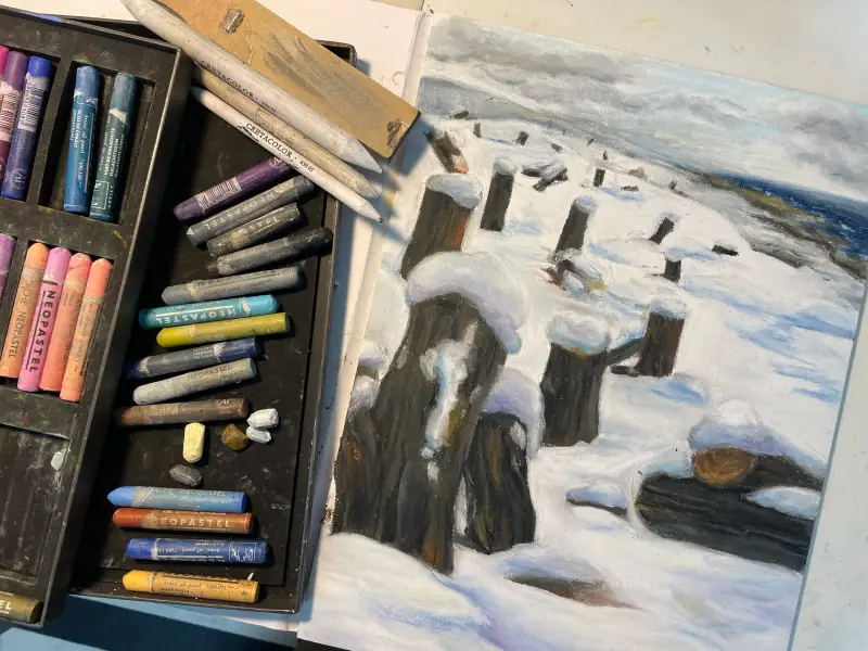 오일파스텔로 색을 입혔는데, 깨끗하게 소복히 쌓인 눈을 표현하는 게 어렵더군요. 하지만 오일파스텔은 어설퍼도 용기를 주는 멋진 재료입니다. 화지를 적당히 밀도있게 채우기만해도 그럴 듯 해보이거든요.