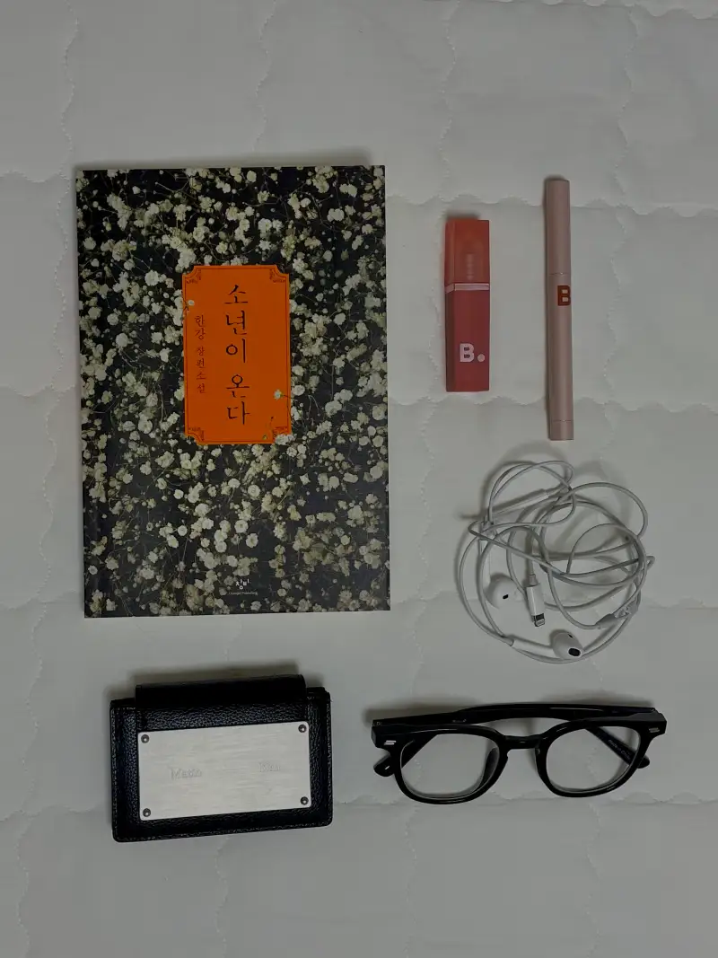 가방 속 책과 안경, 이어폰, 립제품, 지갑
