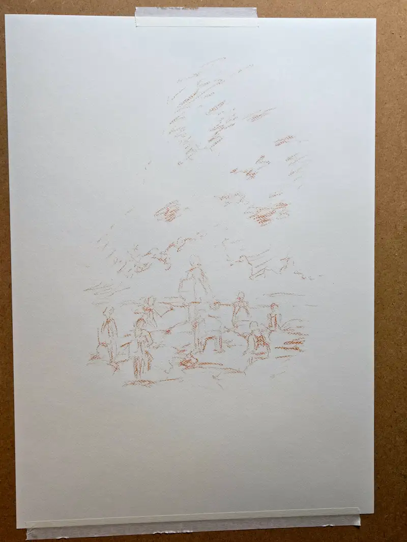 그리고 인물먼저 스틱콘테로 기본채색 후 문교 소프트파스텔(오일파스텔 아니에요!)로 채색들어갔습니다. 머메이드지 표면의 요철이 거칠어서 부드럽게는 안되더라구요.